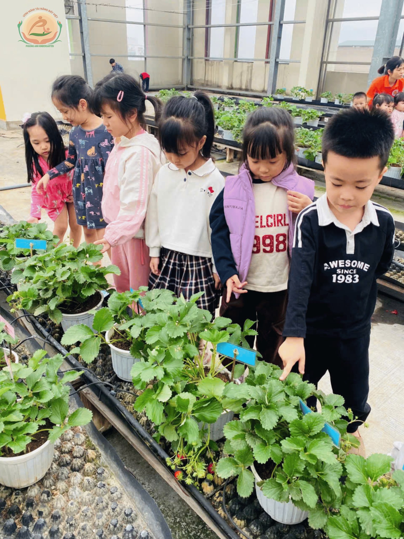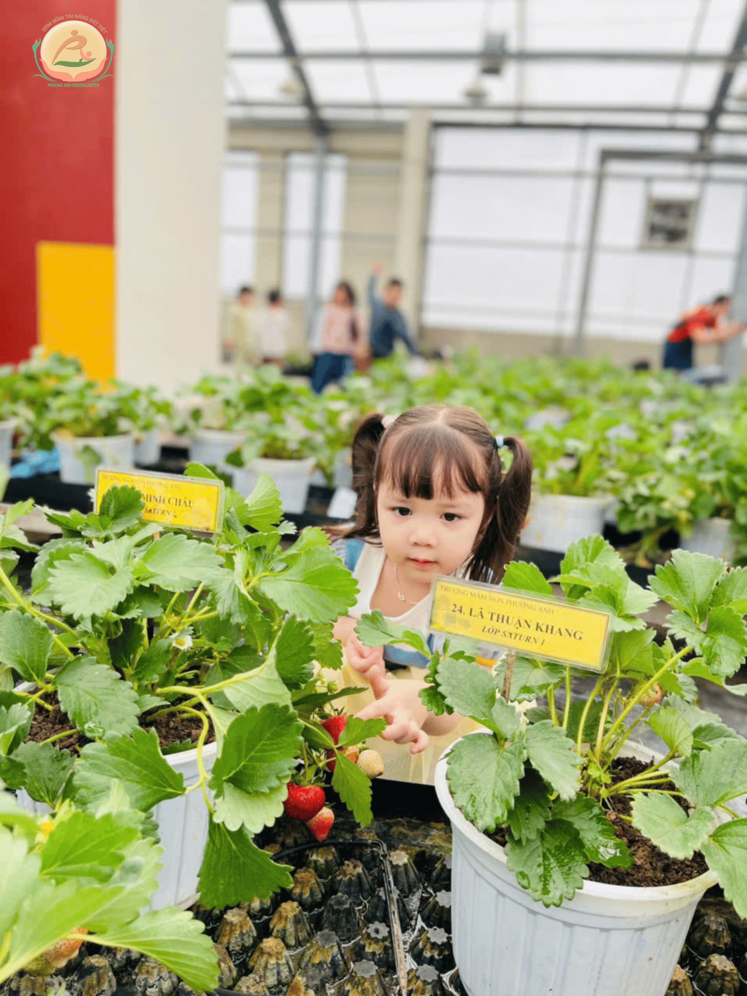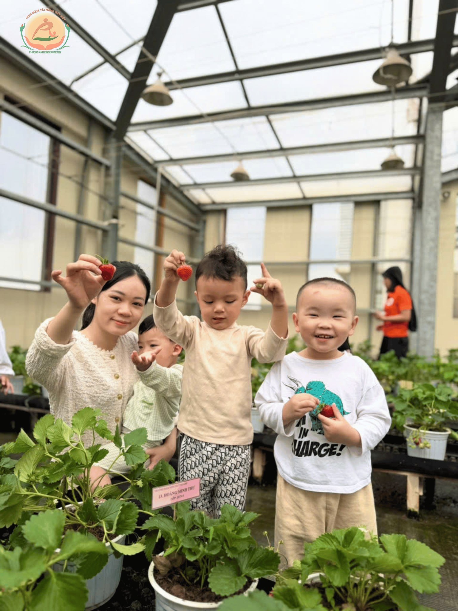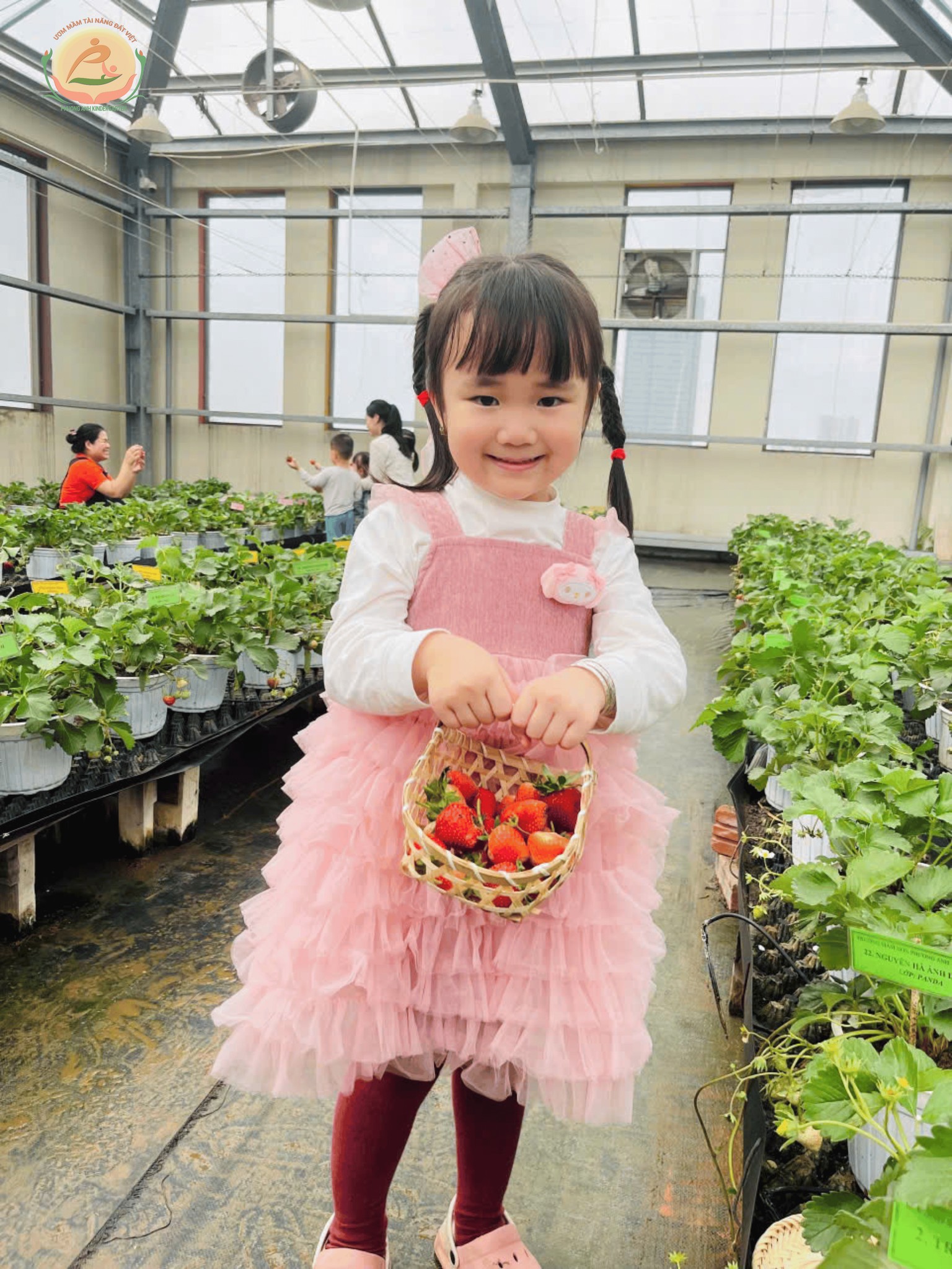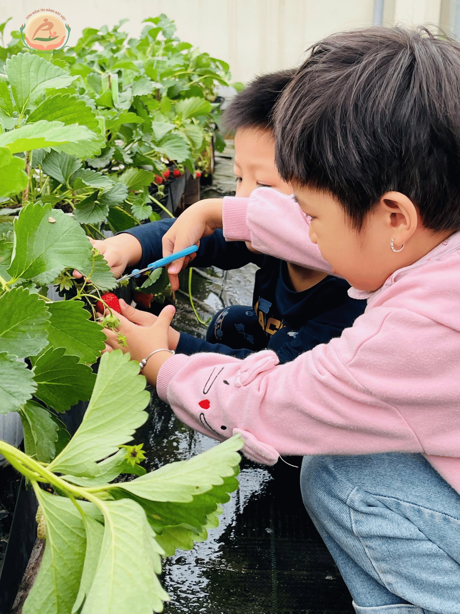 Dưới sự hướng dẫn của cô, các bé nhẹ nhàng nâng niu từng quả dâu, tự tay hái những “thành quả ngọt ngào” mang về. Gương mặt ai cũng rạng rỡ, ánh mắt long lanh niềm vui và sự háo hức.