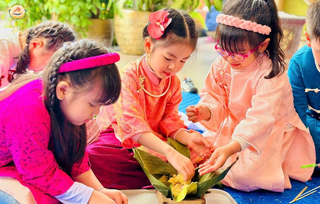 Hôm nay Trường Mầm non Phương Anh rộn ràng khi tổ chức hoạt động trải nghiệm “Gói bánh chưng ngày Tết” cho các con. Không gian ngập tràn sắc xuân với cây quất, cành đào với lá dong xanh, nếp trắng, đỗ vàng… và đặc biệt là tiếng cười trong veo của các bạn nhỏ khi được tự tay chạm…